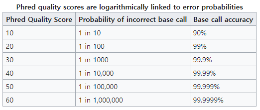 다시말해 A라고 읽혀진 어떠한 염기가 90%의 확률의 정확도를 가진다면 quality score는 10, 99%는 20을 가진다는 의미이다.