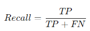 Recall (재현율): 실제 양성인 데이터 중에서 모델이 정확히 예측한 비율을 나타냅니다.Recall=TPTP+FNRecall = \frac{TP}{TP + FN}(TP: True Positive, FN: False Negative)