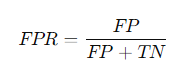 FPR (False Positive Rate): 실제로 음성인 데이터를 모델이 얼마나 잘못 양성으로 예측했는지를 나타냅니다.FPR=FPFP+TNFPR = \frac{FP}{FP + TN}(FP: False Positive, TN: True Negative)